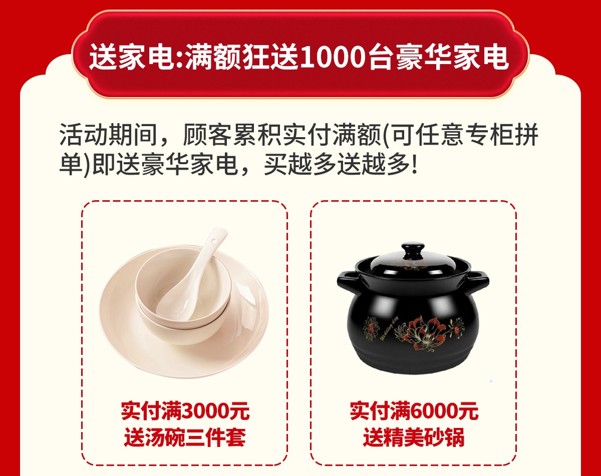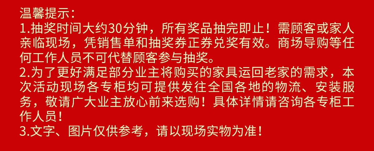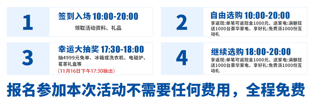 现场百万件特价产品同享活动价,请网上报名锁定优惠折扣,在10月18-19/25-26日、11月1-2/8-9/15-16日(限此10天)亲临现场查看。半年之内送货均有效,特殊情况还可以延迟。